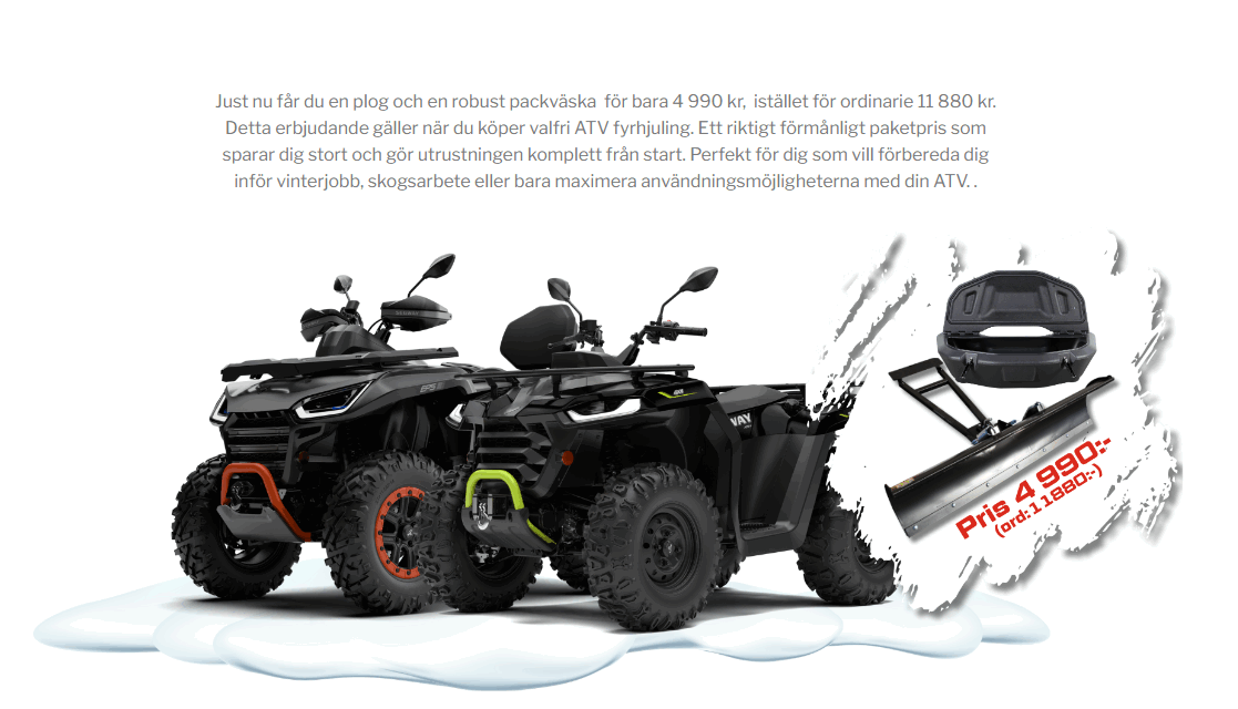 Just nu får du en plog och en robust packväska för bara 4 990 kr, istället för ordinarie 11 880 kr. Detta erbjudande gäller när du köper valfri ATV fyrhjuling. Ett riktigt förmånligt paketpris som sparar dig stort och gör utrustningen komplett från start. Perfekt för dig som vill förbereda dig inför vinterjobb, skogsarbete eller bara maximera användningsmöjligheterna med din ATV. .